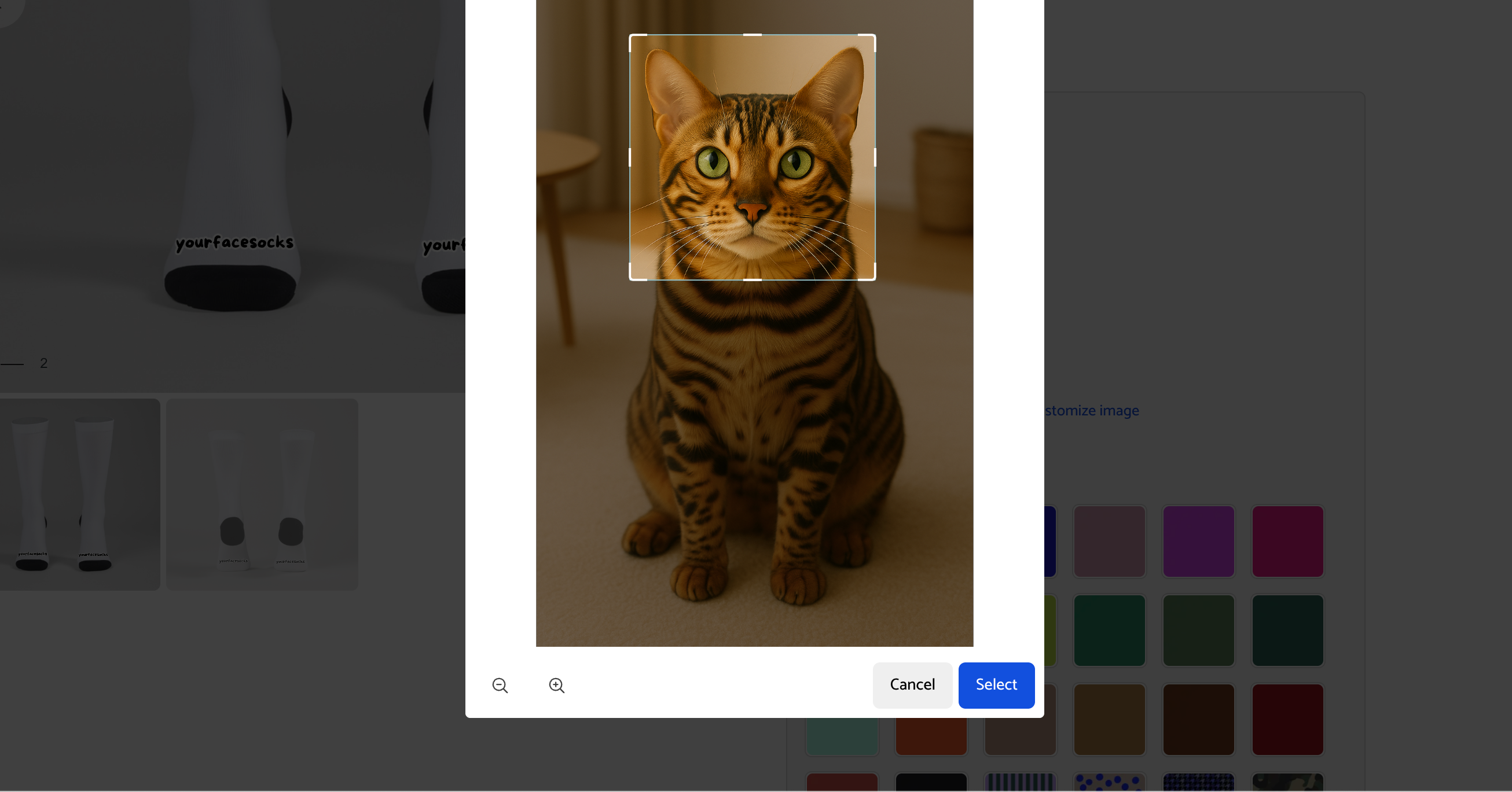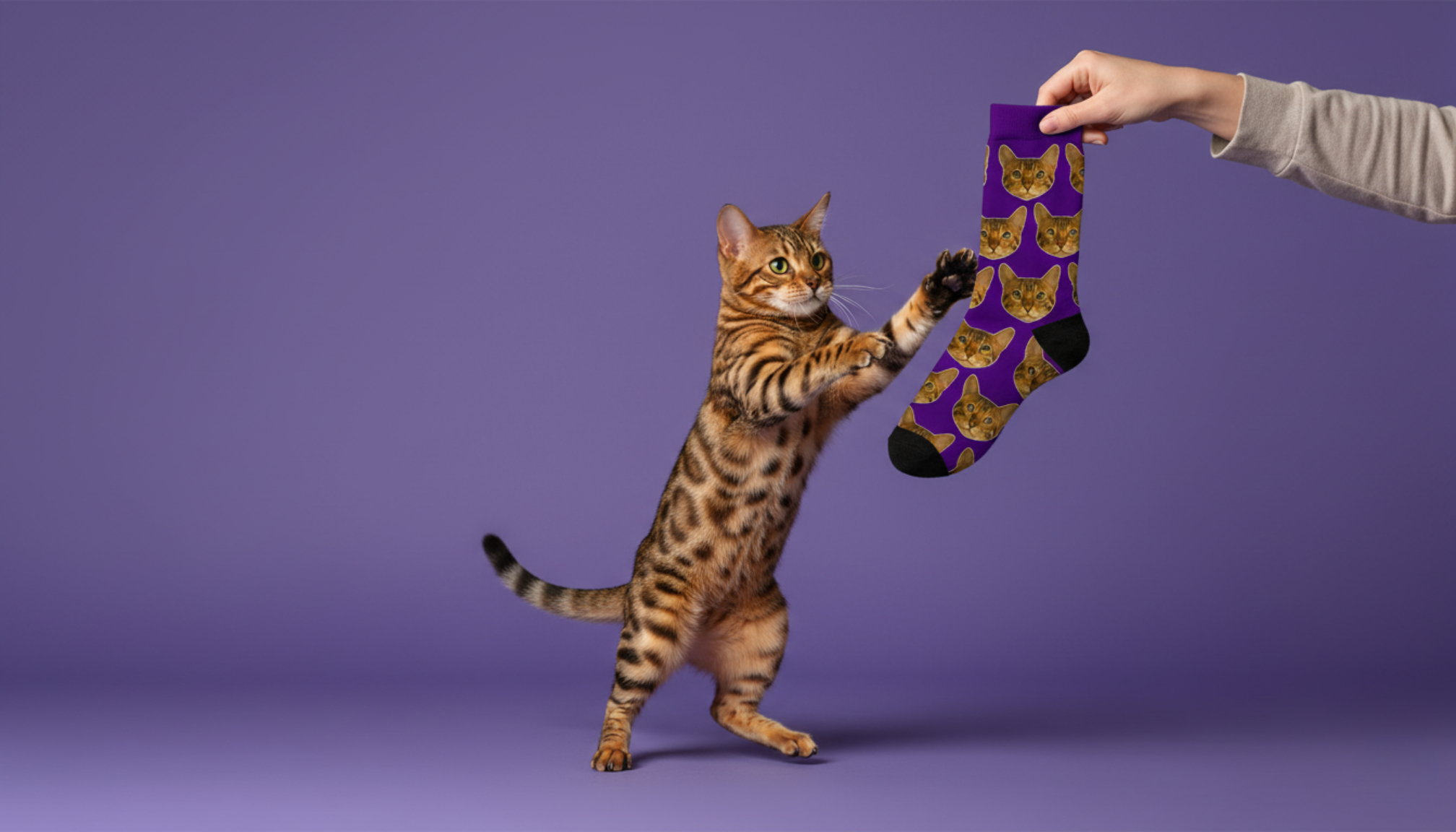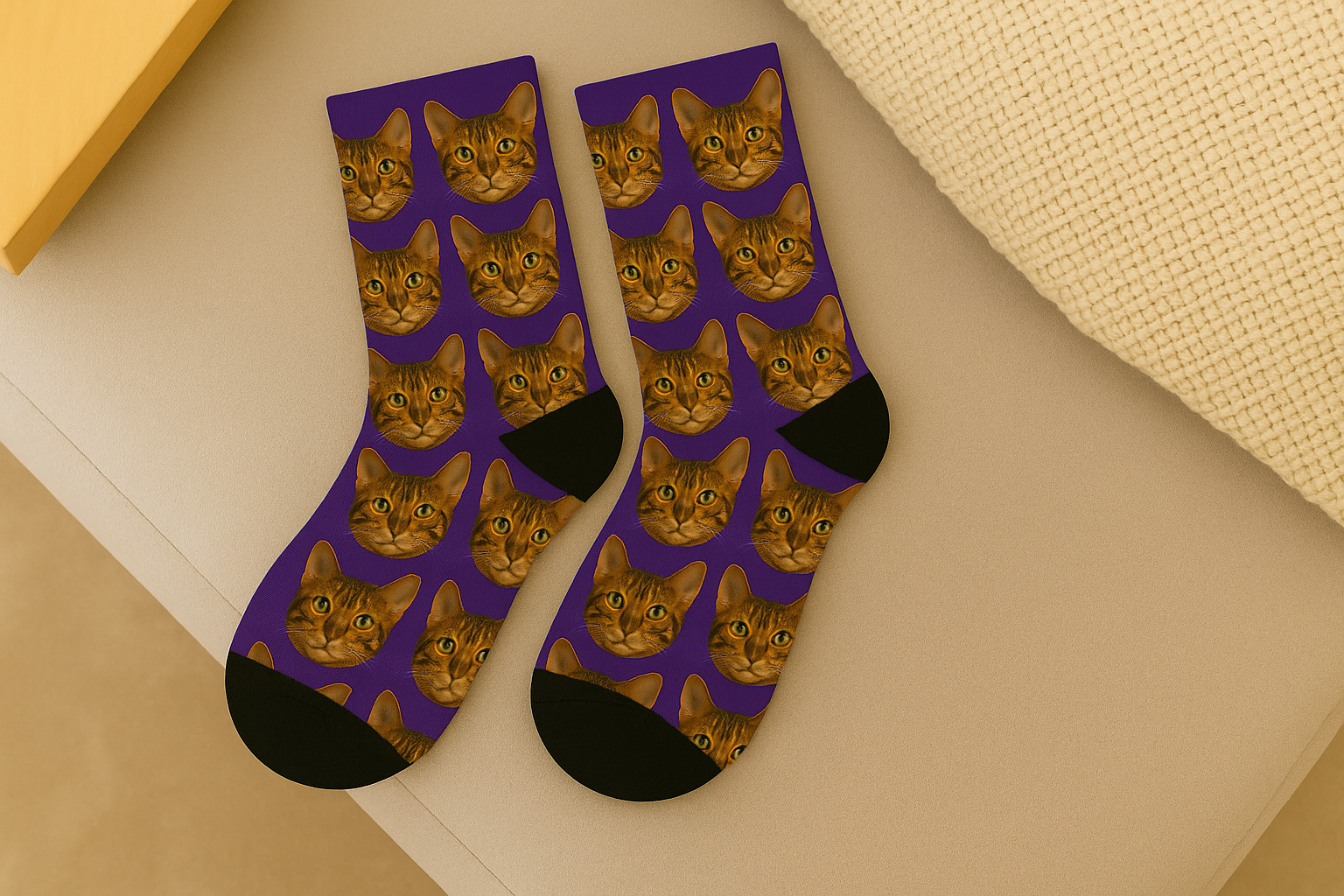 Upload the image, and we’ll automatically remove the background. Then, choose your sock color and background design.